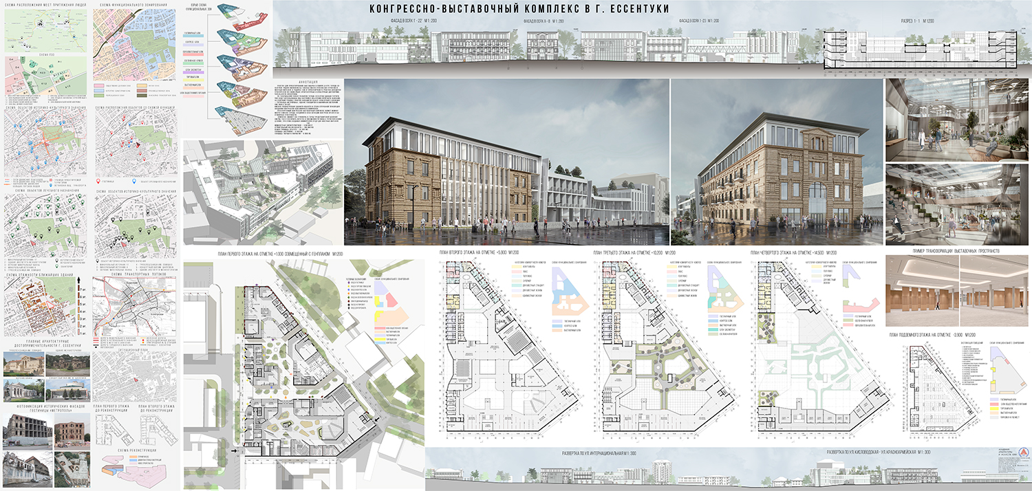 В настоящее время участок, находящийся в самом центре города Ессентуки, представляет собой территорию, застроенную объектами, находящимися в аварийном состоянии. На северной границе участка находится объект культурного наследия – гостиница «Метрополь». Здание находится в аварийном состоянии уже более 20 лет и остро нуждается в реконструкции с сохранением исторического фасада. Важной задачей являлось подчеркнуть старые фасады гостиницы, органично вписав их в объём новой части комплекса. Комплекс разделён по принципу функционального зонирования на такие блоки как: -гостиничный; -конгрессный; -торговый; -образовательный; -блок общественной библиотеки; -блок общественного питания.